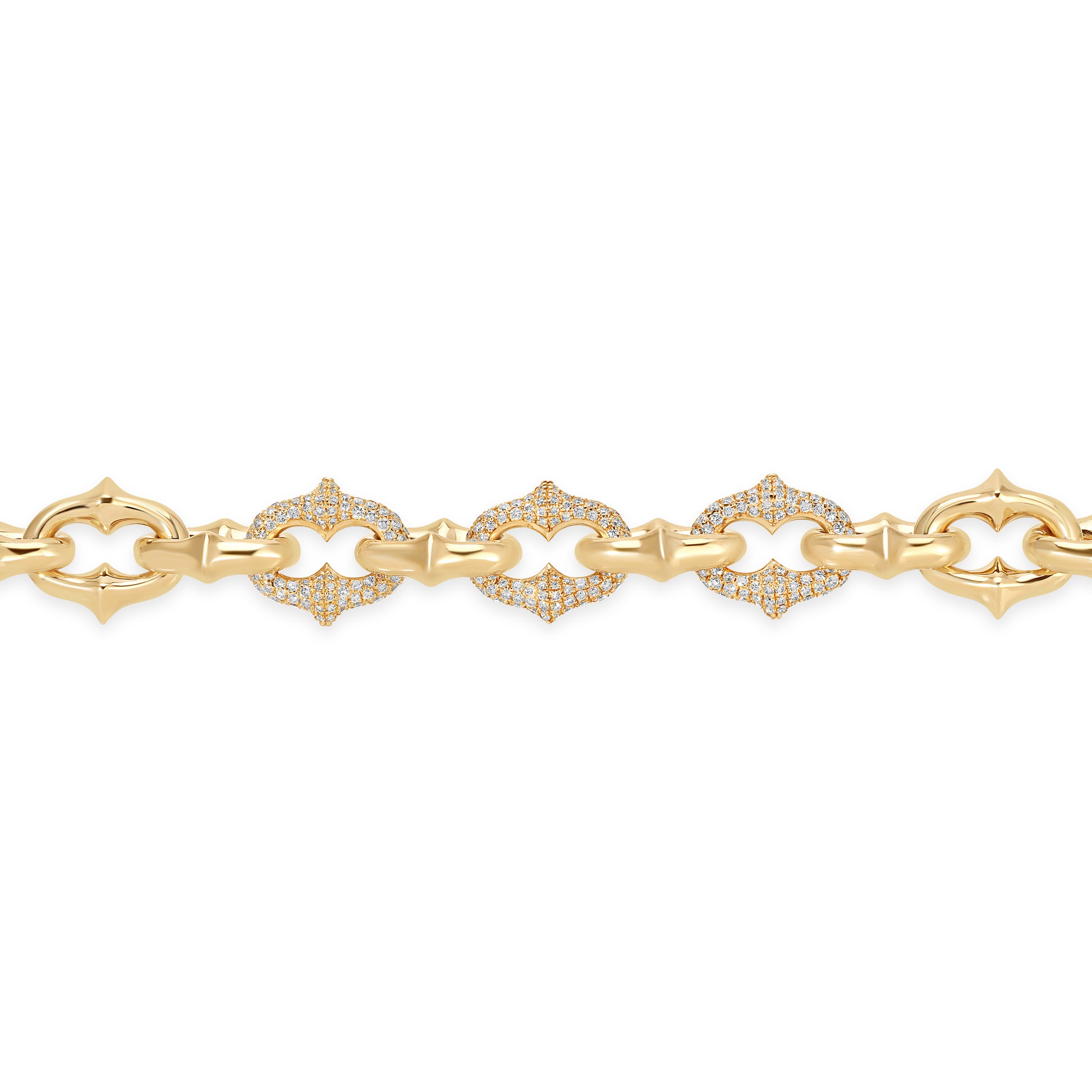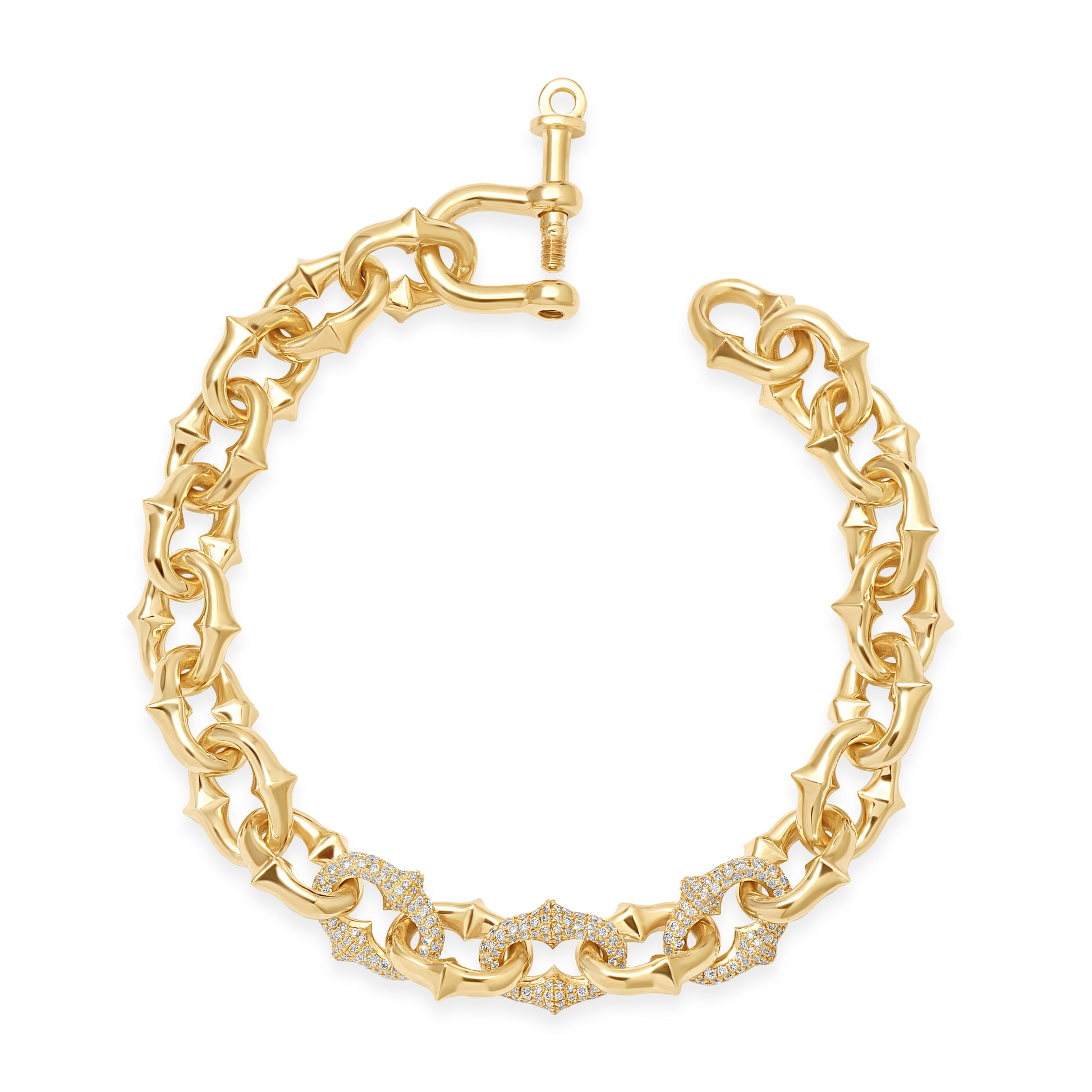 Our proprietary medium width Tattoo Link, first introduced in 2022, handcrafted one link at a time in solid 18k yellow gold. Features three links hand set with over ~2 carats of natural white diamonds. Roughly 12mm wide links. Horseshoe screw closure. Handmade in Los Angeles.