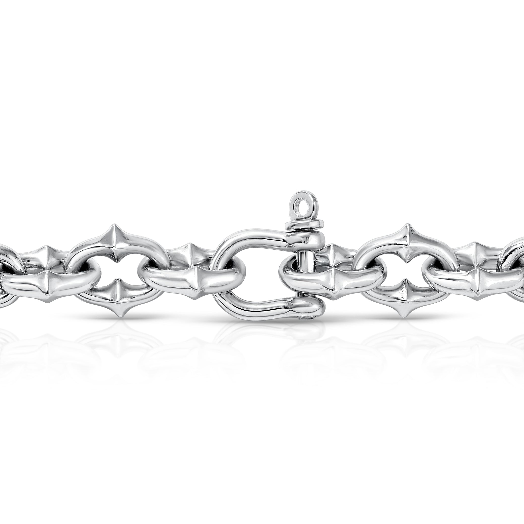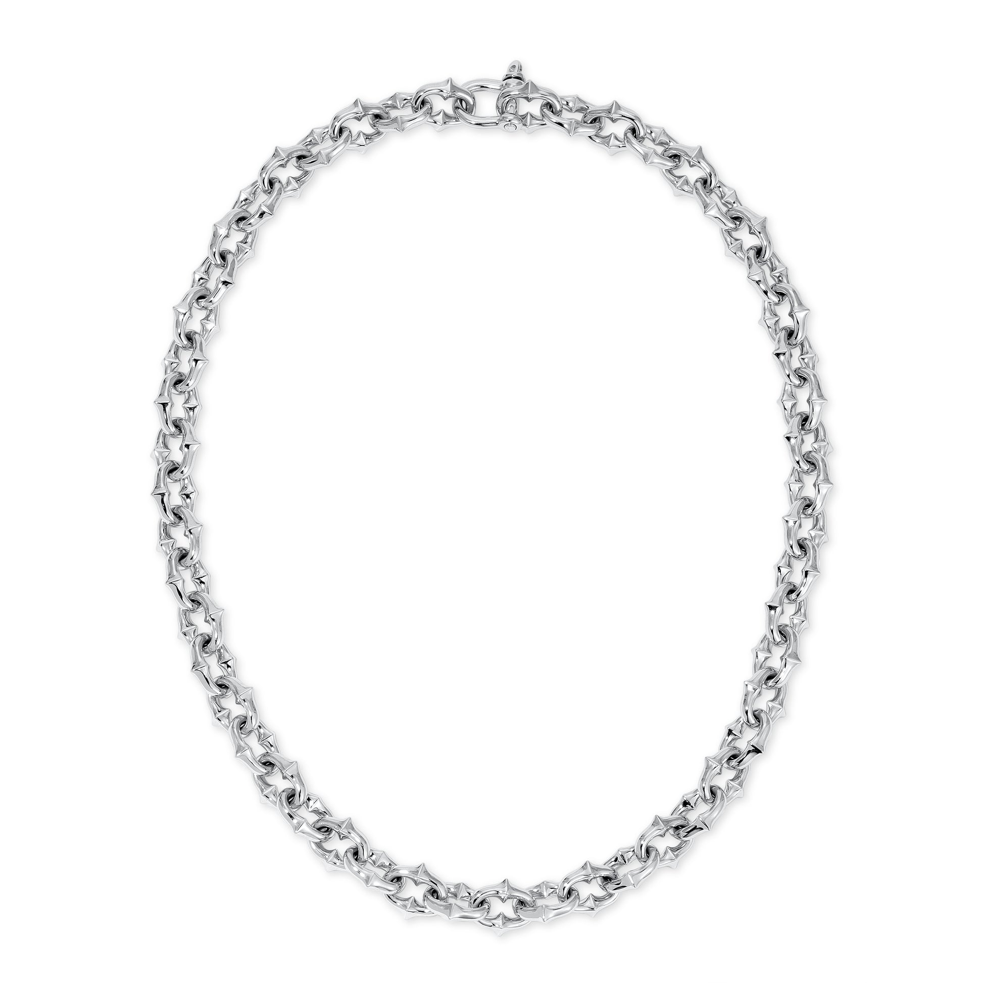 Our proprietary Tattoo Link Chain handcrafted in solid .925 sterling silver. Medium width, 12mm wide. Horseshoe screw closure. Imported.