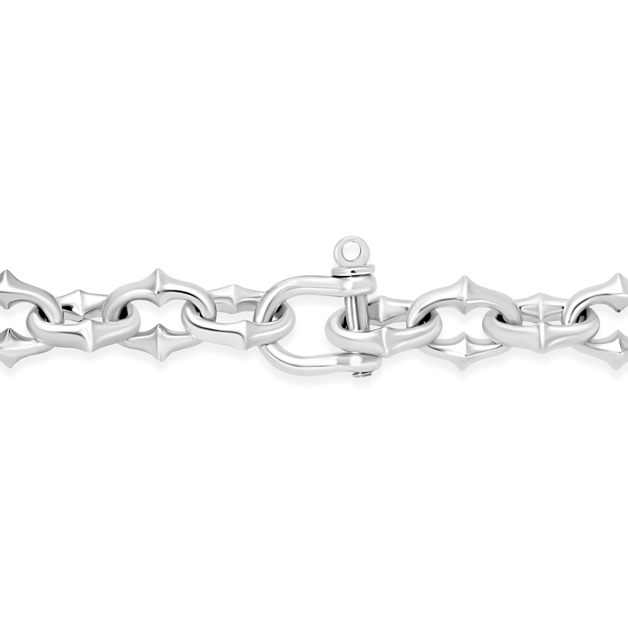Our proprietary Tattoo Link bracelet handcrafted in solid .925 sterling silver. Small width, 8mm wide. Horseshoe screw closure. Imported.